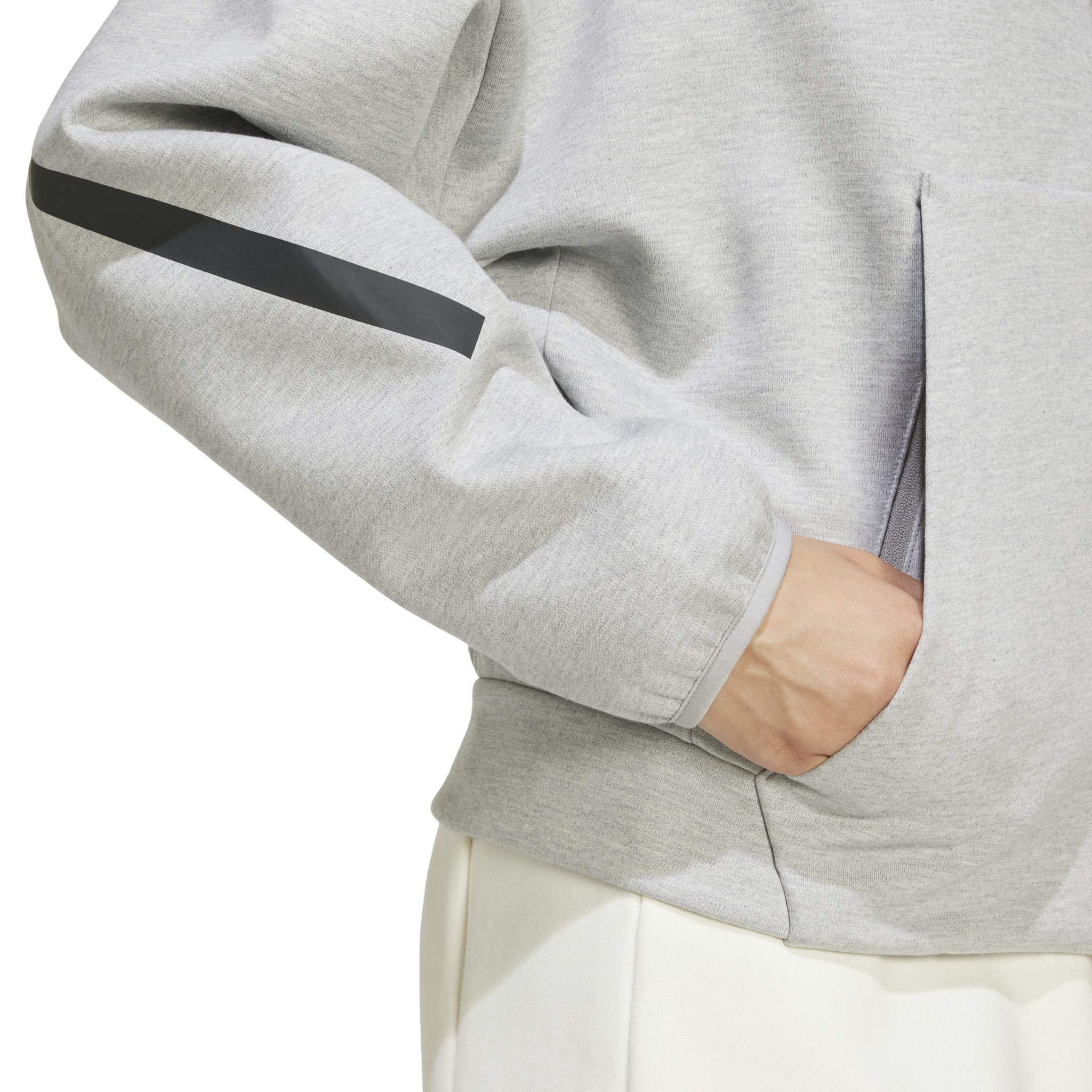 Embrace the feeling of belonging and community with this adidas Z.N.E. full-zip hoodie designed for women. The loose-fit track top is knit from a sustainable blend of 57% recycled polyester and 43% cotton, designed for maximum warmth and dryness with a unique three-layer doubleknit spacer fabric. Featuring matte rubber prints inspired by iconic field lines, tech-inspired drawcords and zippers, it offers an effortless mix of style, comfort and positive vibes.