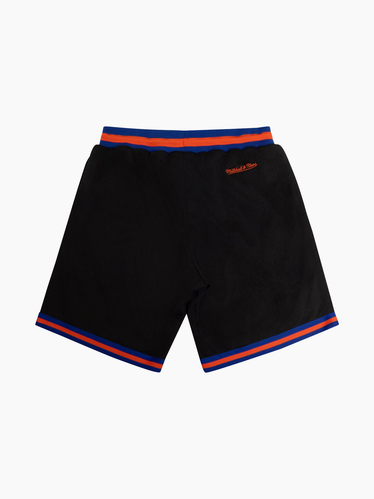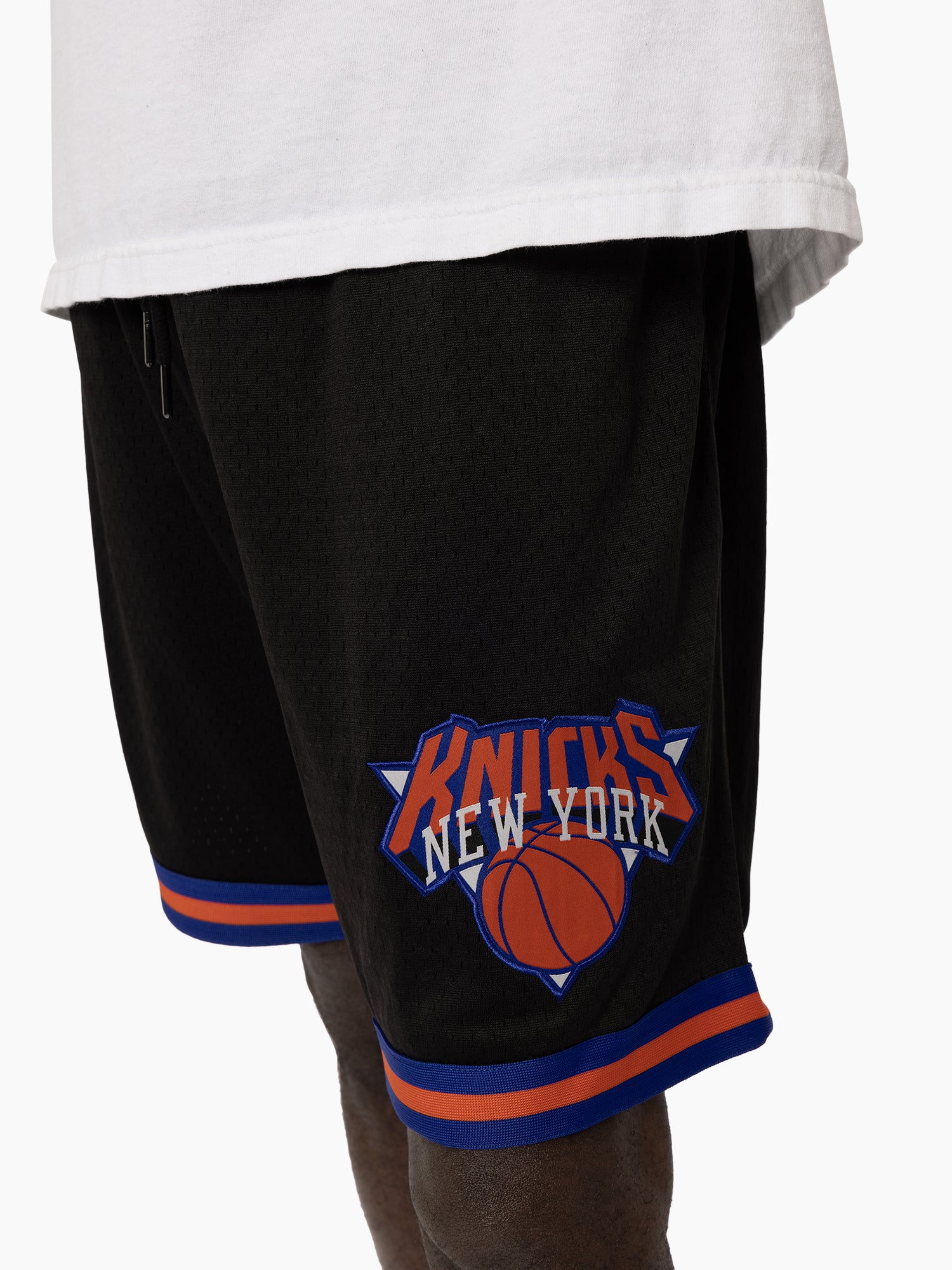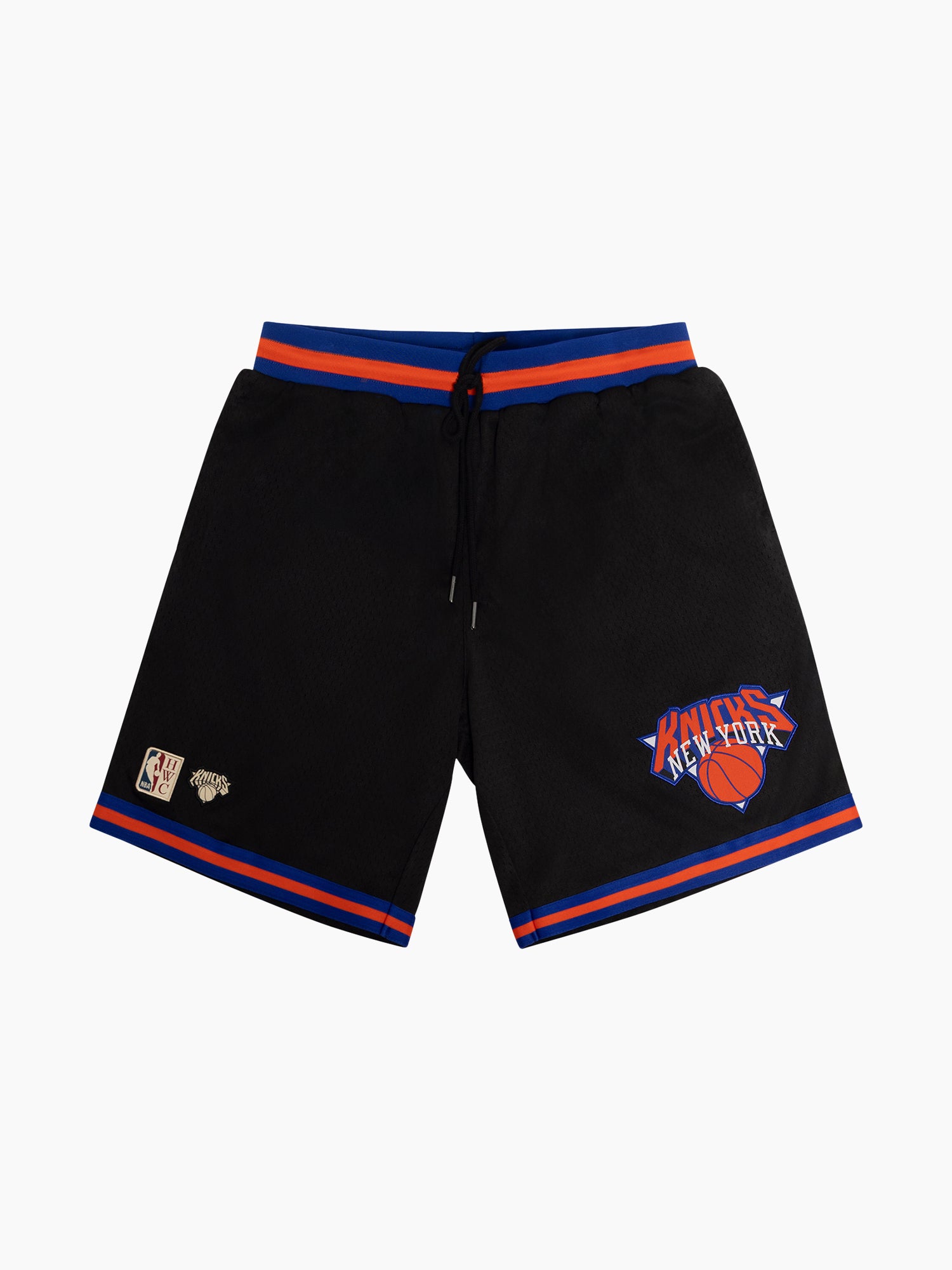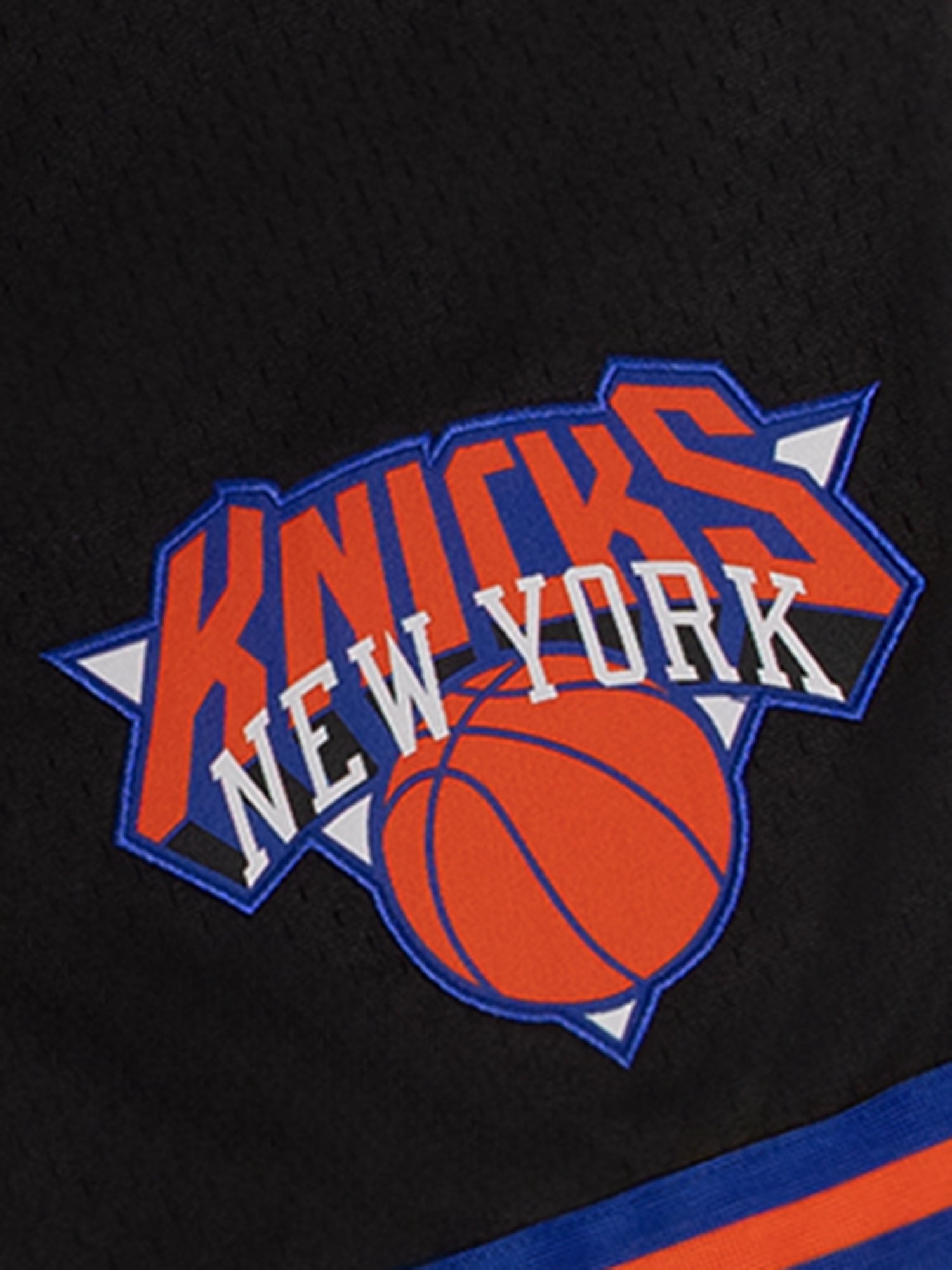 Crafted from breathable black mesh, they feature bold royal blue and orange striped trim that channels classic Knicks energy. The iconic New York Knicks logo is embroidered on the left leg for an authentic finish, while zippered side pockets offer secure storage on the go.