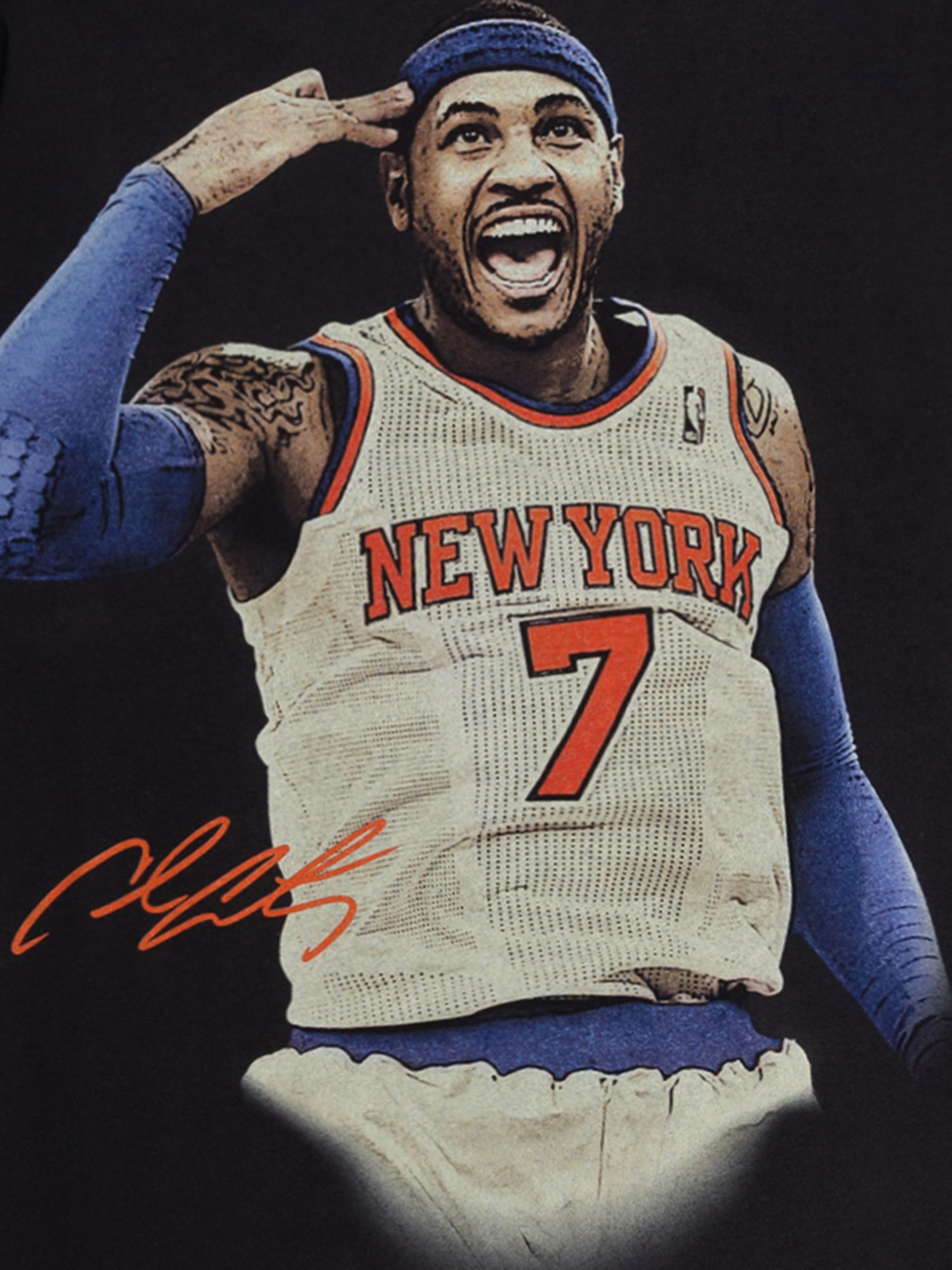 The front features an oversized graphic of Carmelo Anthony flexing in his No. 7 Knicks jersey, complete with his printed signature. Flip it over and you’ll find a full stat sheet of his career highlights—from 10× NBA All-Star to 2012–13 Scoring Champion—finished with a nod to his historic 62-point game at Madison Square Garden.