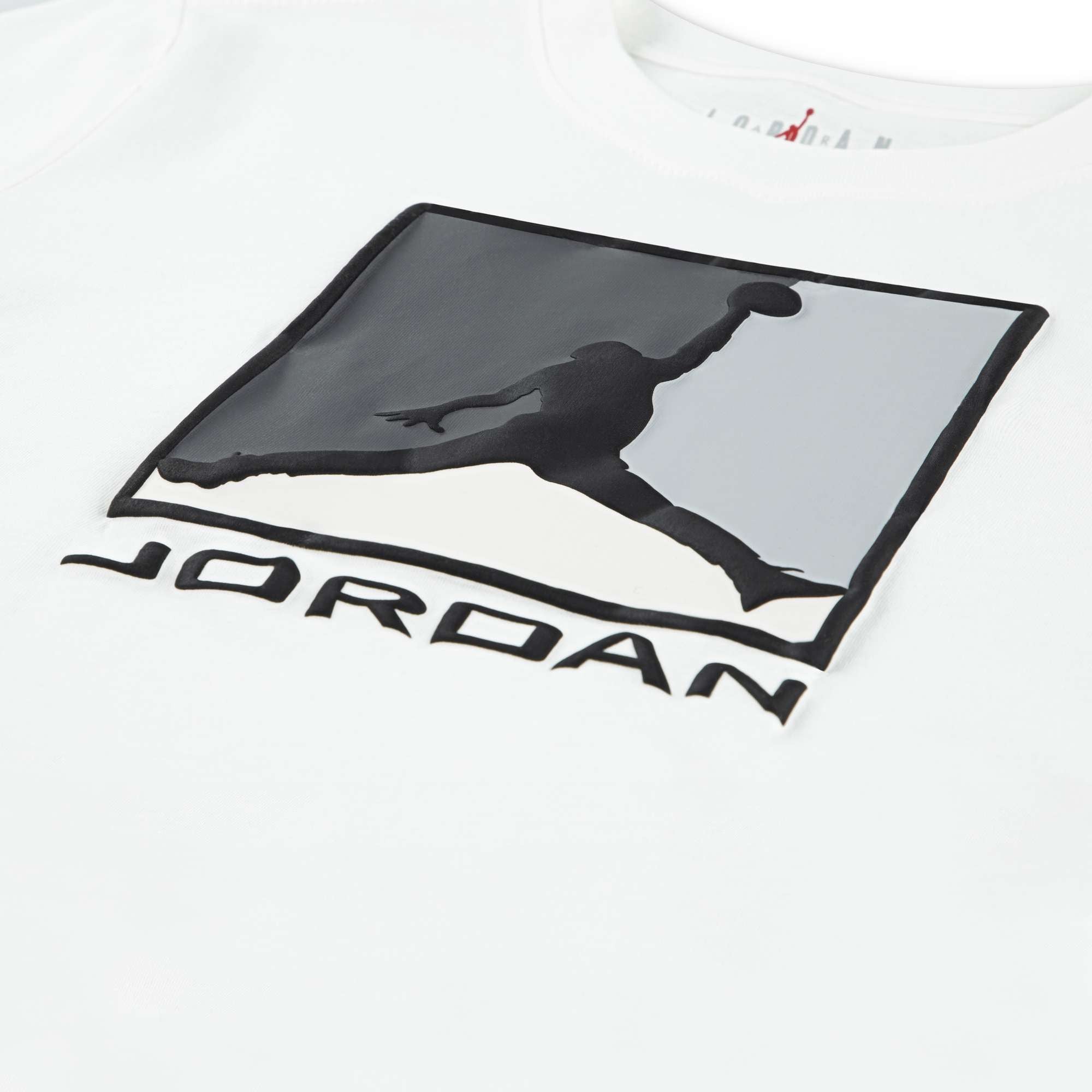 Cotton/poly jersey knit fabric. Tagless ribbed crewneck. Short sleeves. Boxed Jumpman logo graphic on the chest.